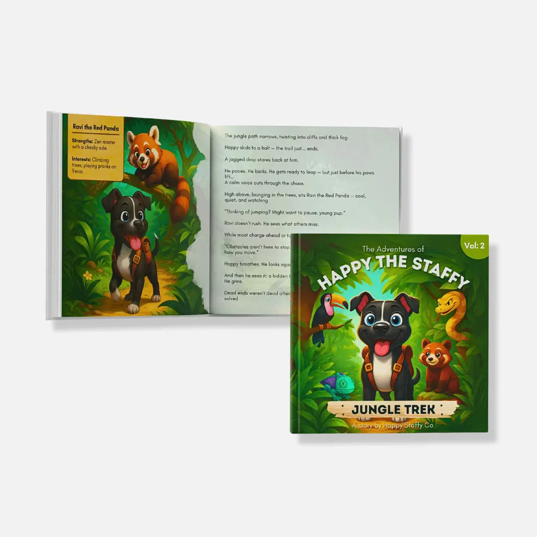 Every Jungle Trek Collection comes with a hardcover storybook written and illustrated by Happy Staffy Co. Perfect for fur children and real children, it’s packed with adventure and life lessons your whole family will love.