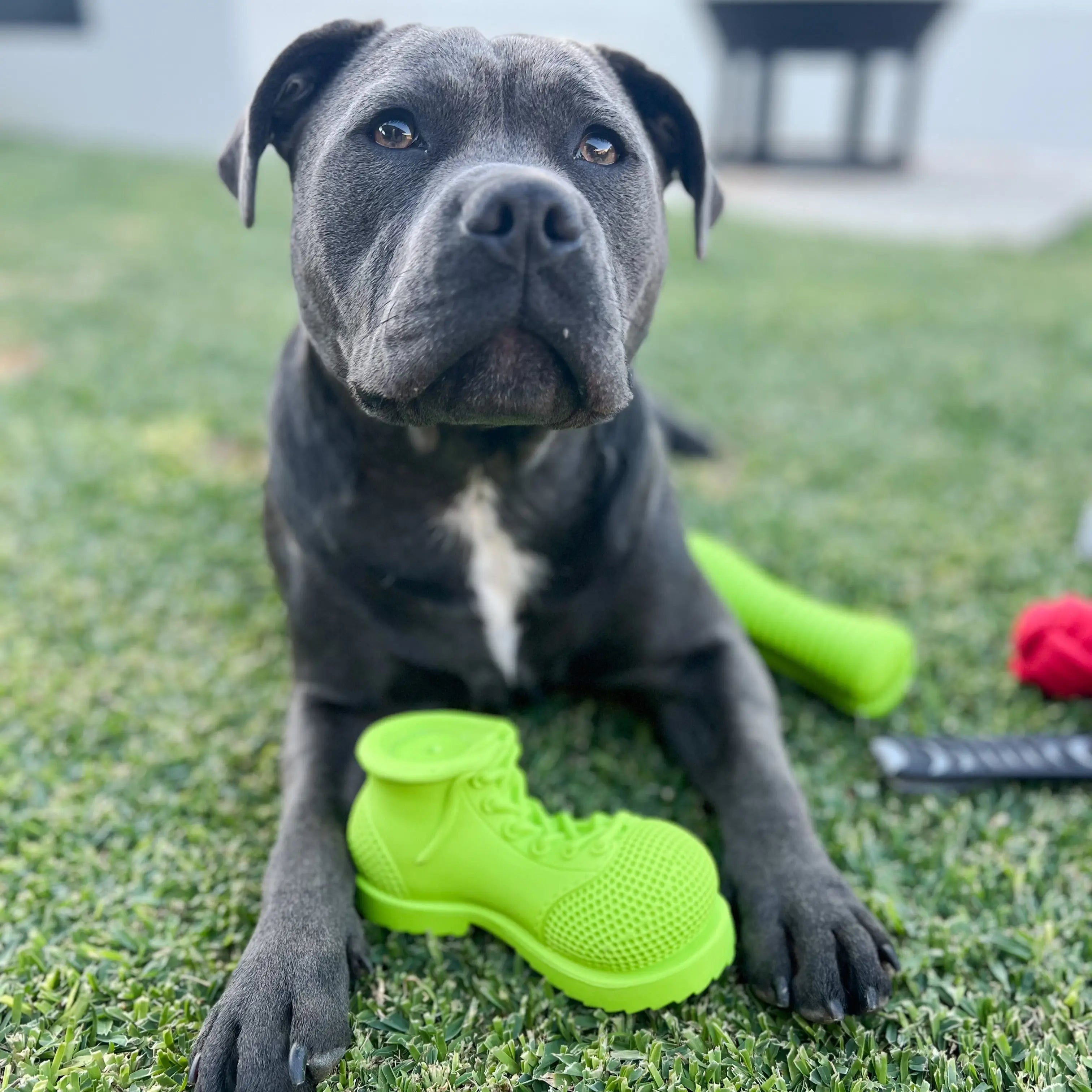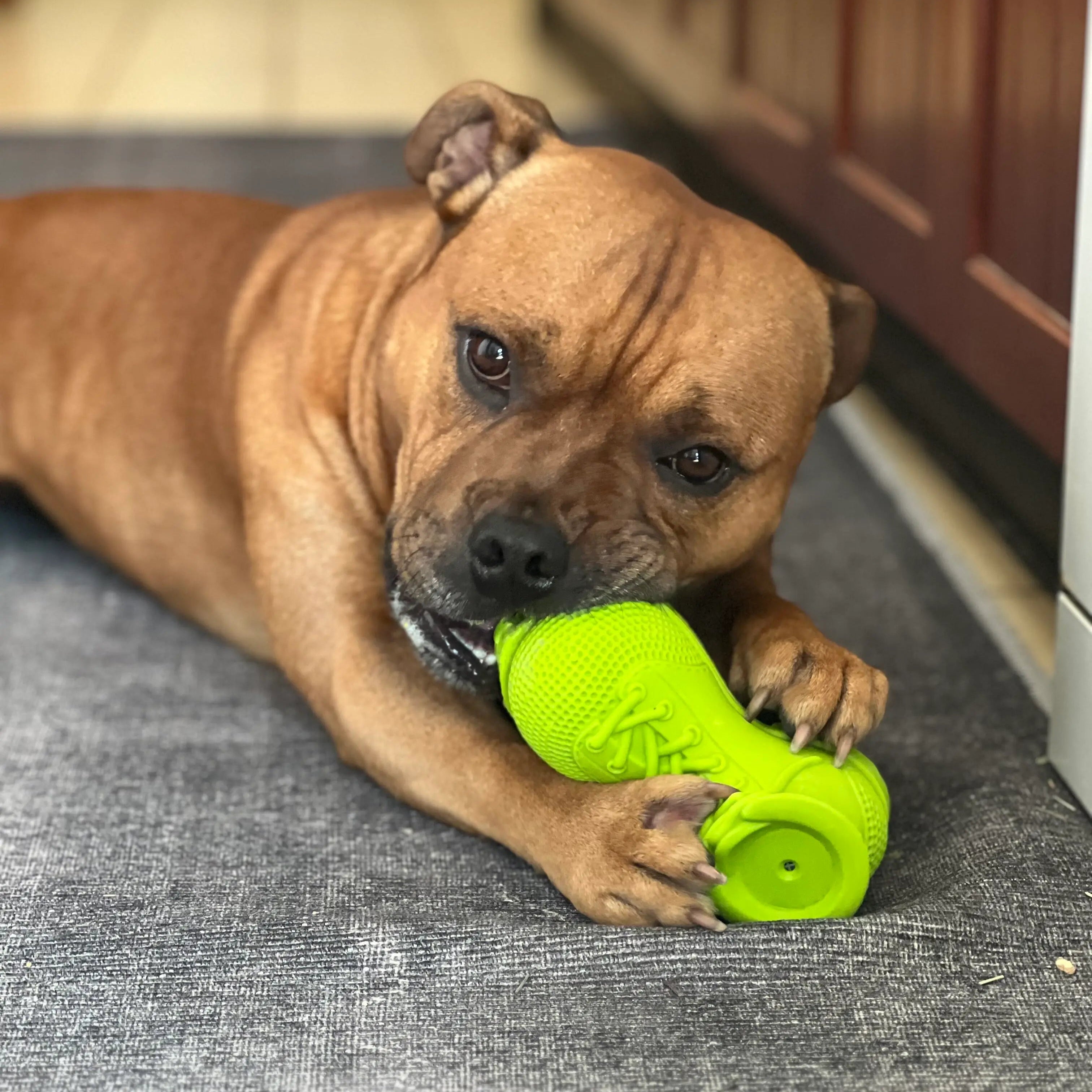 This shoe features special grooves underneath where you can add your dog's favourite spreads like Greek yogurt or peanut butter. It's a fun way to keep your pup mentally engaged and entertained while also enjoying a tasty treat.
