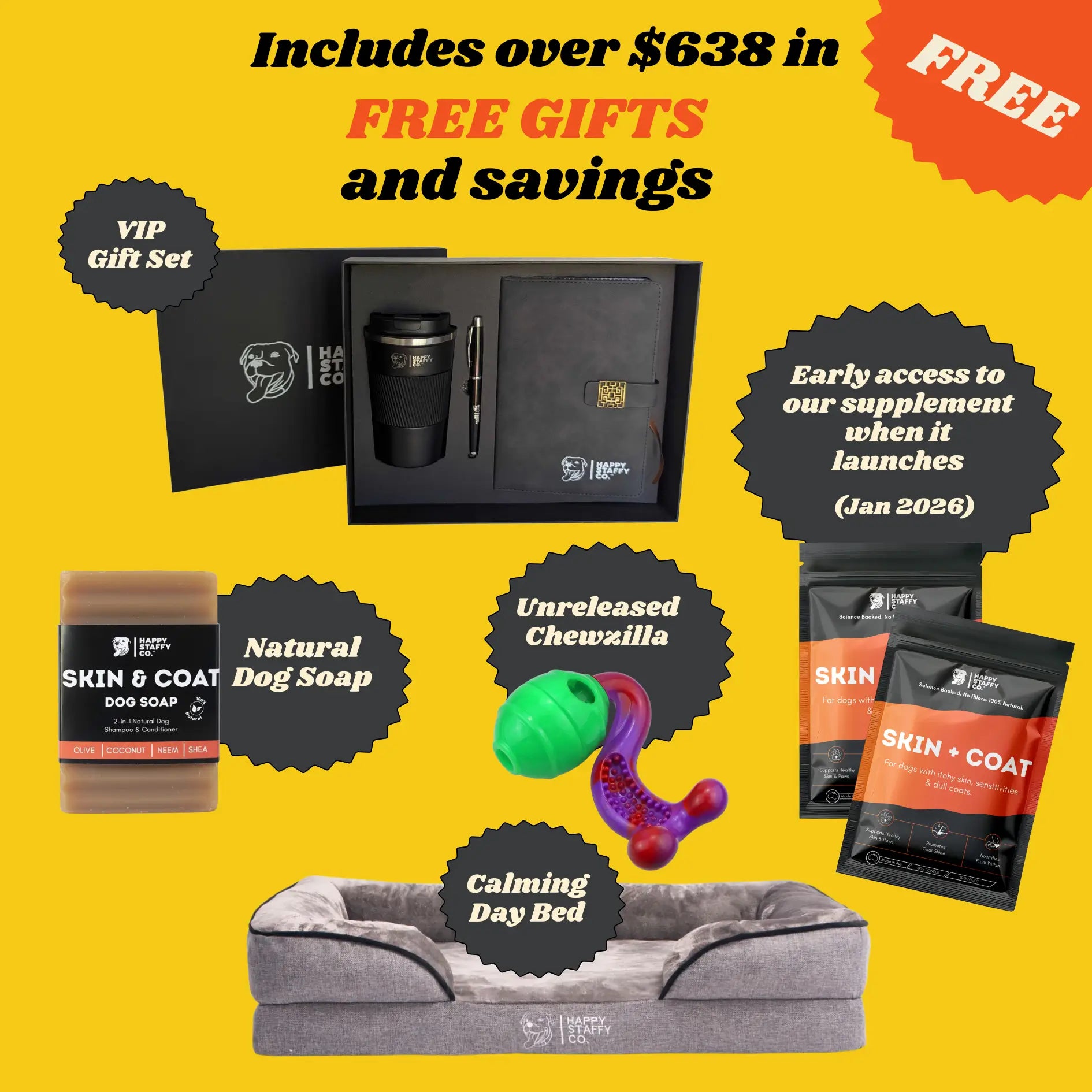 Plus, we’ve added bonus extras: a treat-dispensing toy, 100% natural dog shampoo, and a 60-day supply of our unreleased Gut, Skin & Coat supplement (shipping late December).