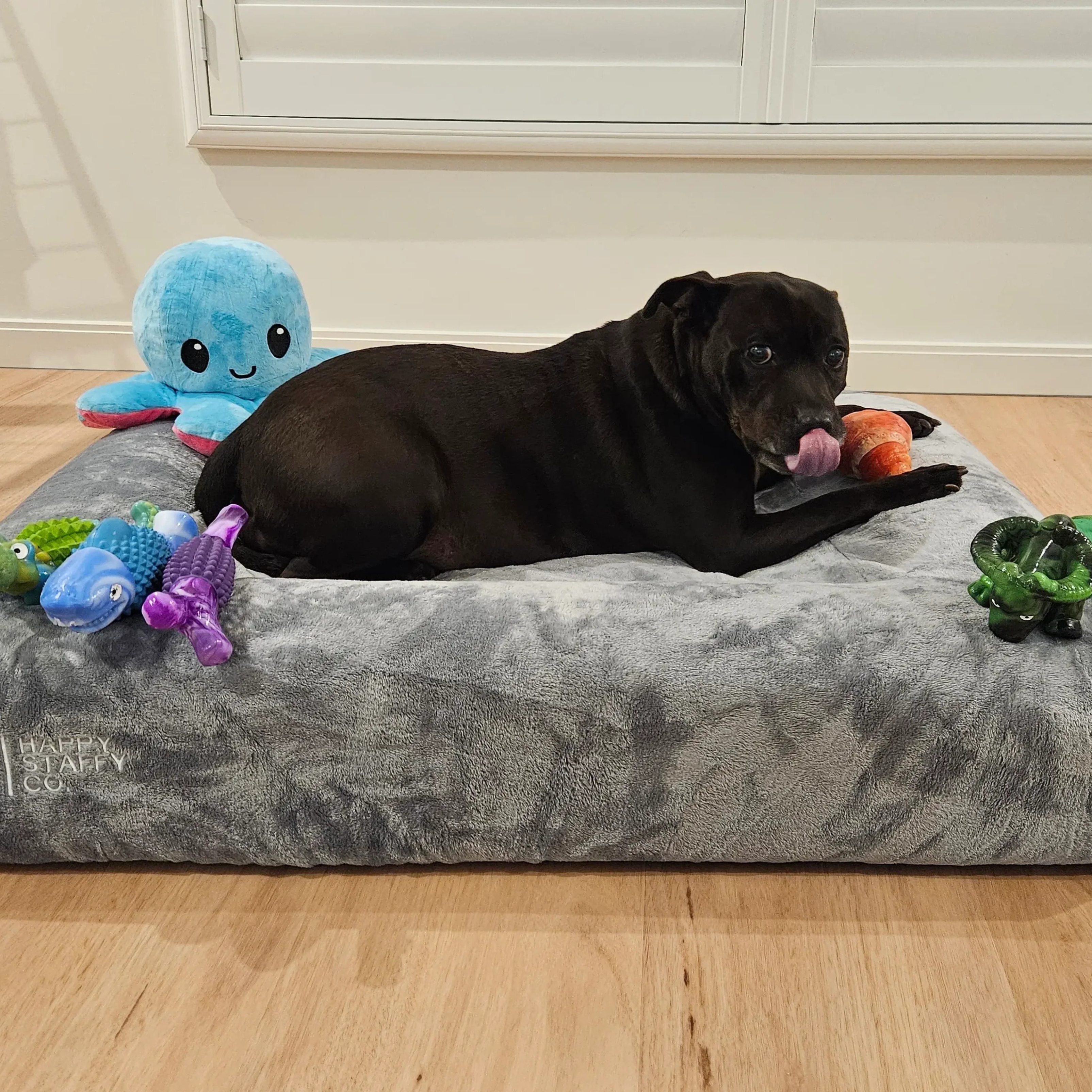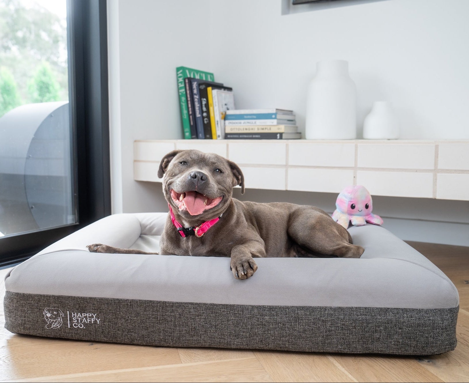 myla.thebluestaffy My lovely new calming day bed🤍 thankyou so much @happystaffyco Feels like a dream, I am one lucky pup!