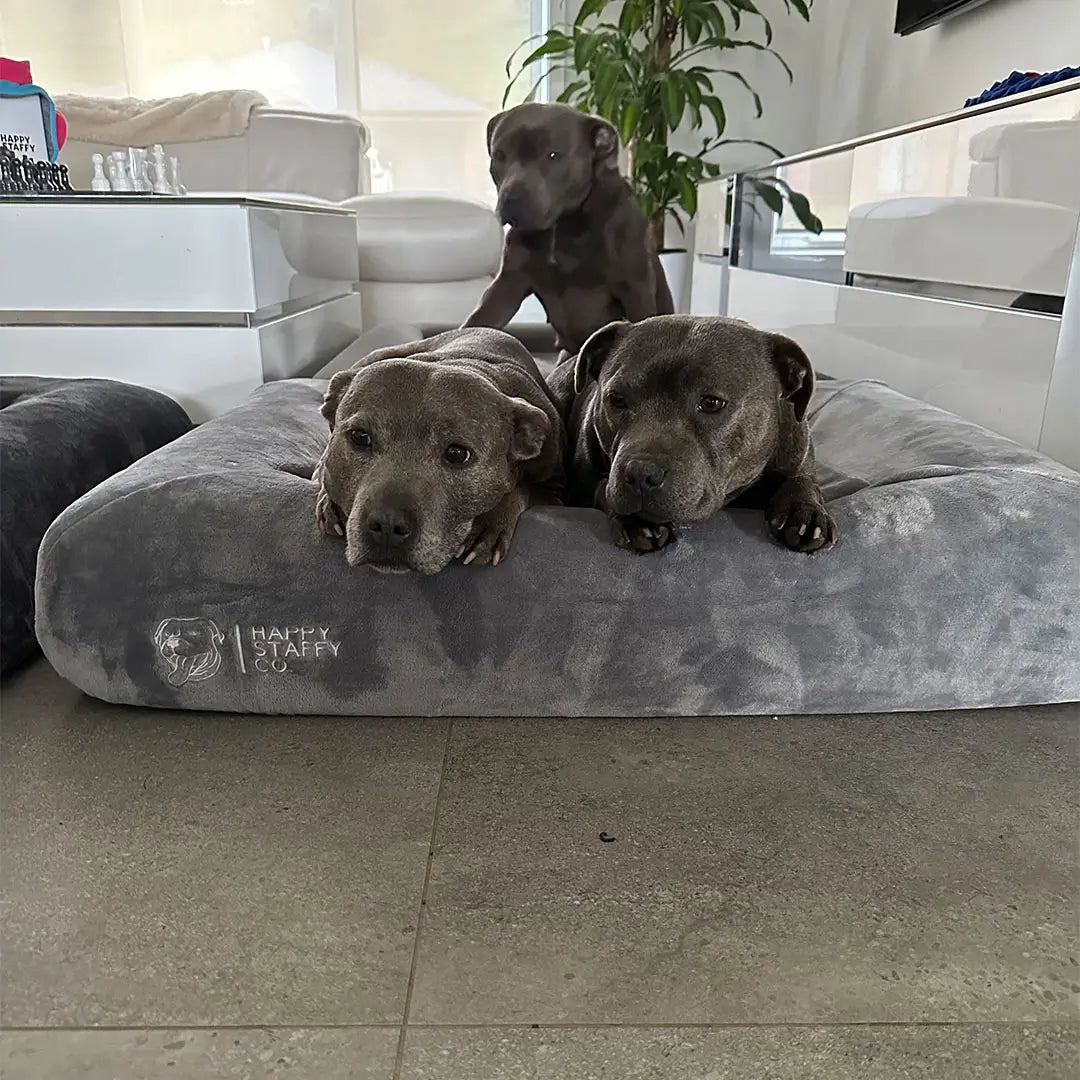 myla.thebluestaffy My lovely new calming day bed🤍 thankyou so much @happystaffyco Feels like a dream, I am one lucky pup!