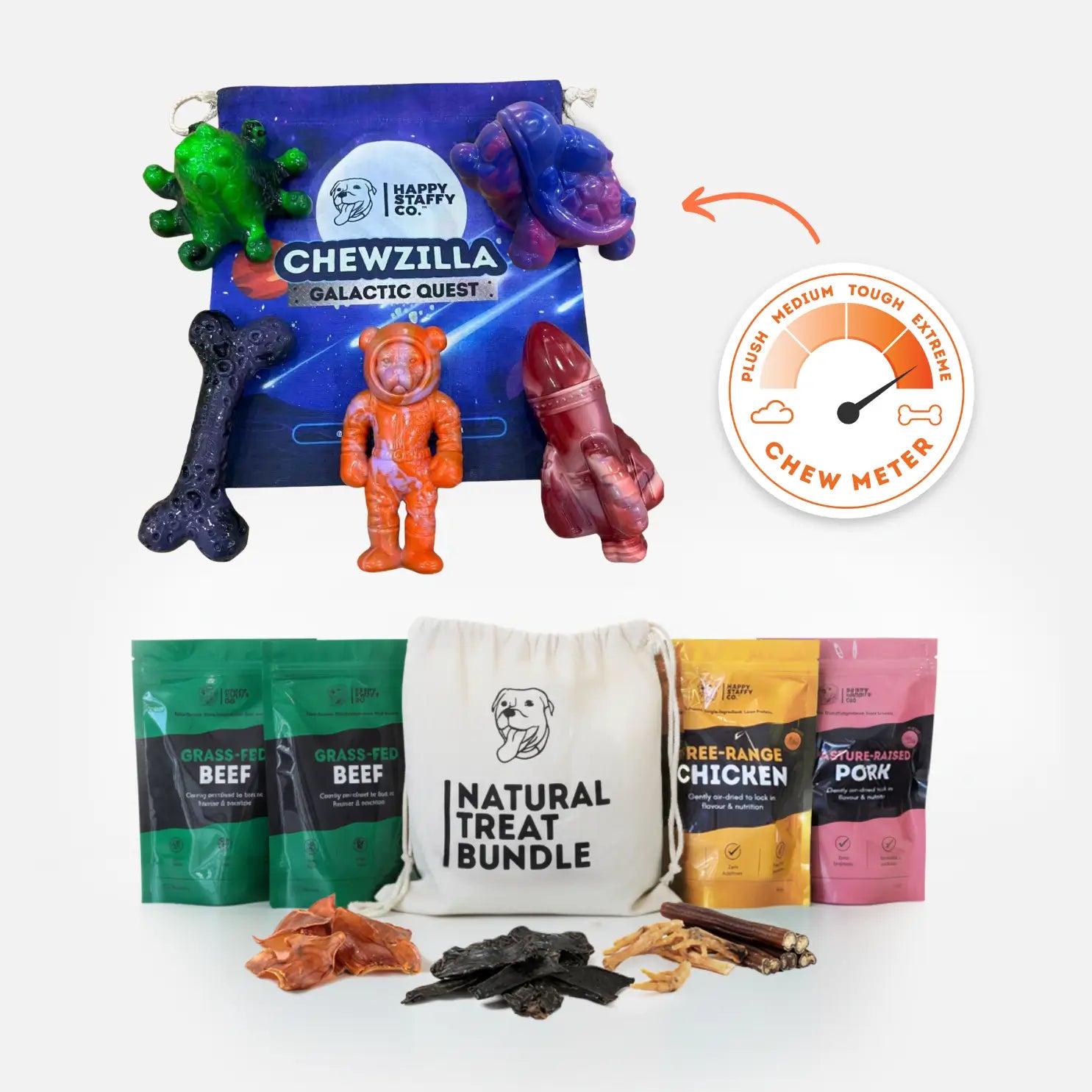 Introducing our Toy & Treat Combo (Chewzilla®) - If your pup loves to chew tough toys and enjoy delicious treats, this bundle is for you.