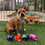 A step down in toughness from Chewzilla® but a step up in interactive fun! These toys combine nylon with rubber for a mix of textures dogs love, plus squeakers and treat grooves for extra fun. They’re more flexible than our Chewzilla® toys and aren’t covered by our 90-day guarantee—but still built for tough play!